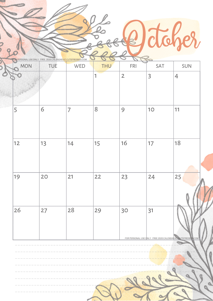 Hi there! Here’s our free printable October 2020 calendar for you! There are halloween and autumn calendar themes for you to enjoy. Choose a Sunday start or Monday start calendar. Download your favorite free printable October 2020 calendar and start planning an awesome month. You may also click the links to download the complete 2020 (or 2021) monthly calendar.