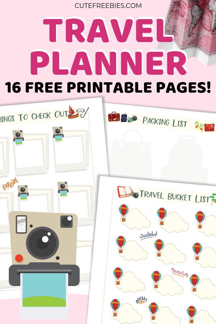 Free Printable Travel Planner And Journal Stickers! Includes a packing list, travel bucket list, and more travel-themed pages for your binder or bullet journal. #bulletjournal #travel #wanderlust #freeprintable #travelplanner #cutefreebiesforyou