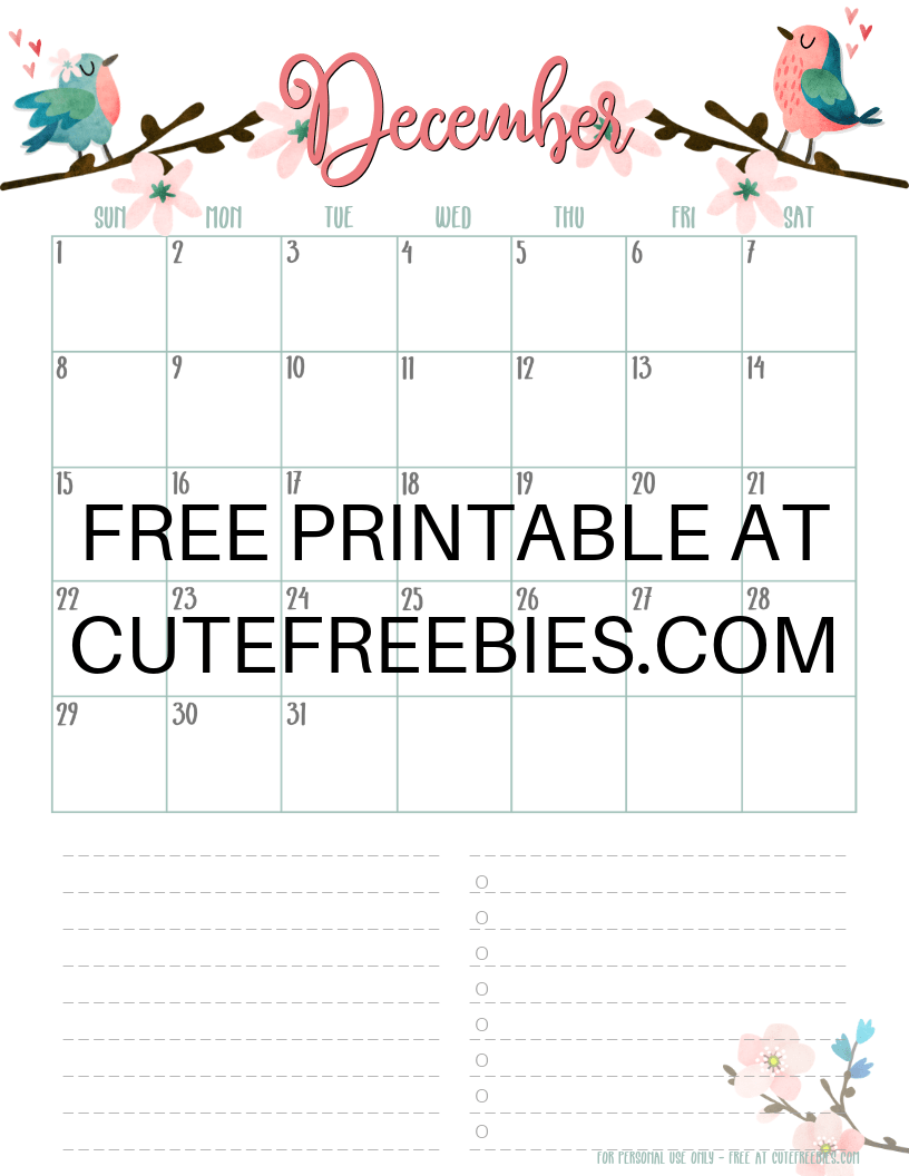 December 2019 Calendar Planner -Free Printable #cutefreebiesforyou #freeprintable