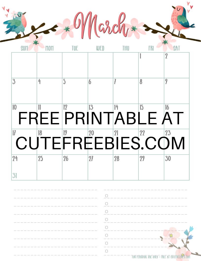 March 2019 Calendar Planner -Free Printable #cutefreebiesforyou #freeprintable