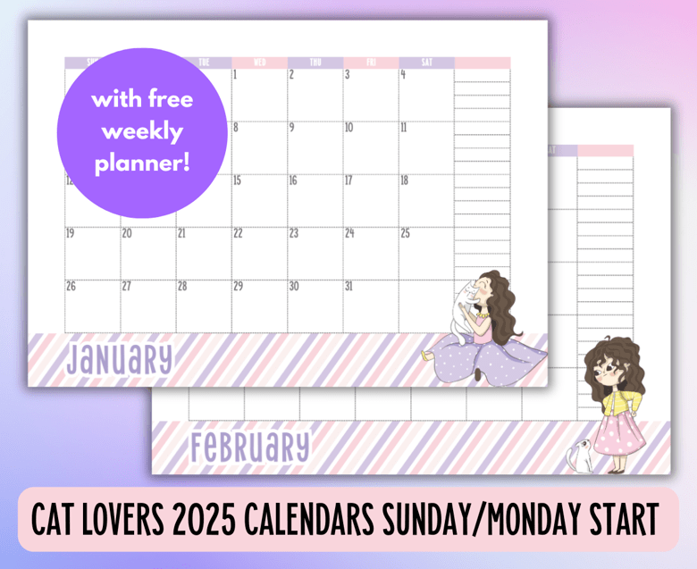 Next is our cute cat lover calendar for 2025! Each 2025 monthly planner has a unique clipart from the Girl with cat stickers part 1 and part 2. (Affiliate links here.) You may also purchase these clipart and create your own stickers!